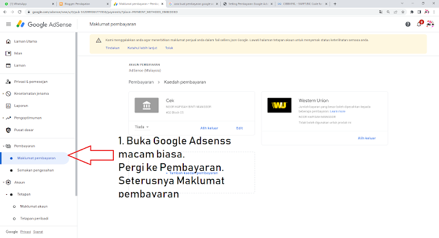 | 1. Buka Google Adsense di bahagian Pembayaran > Maklumat Pembayaran > Tambah kaedah pembayaran |
